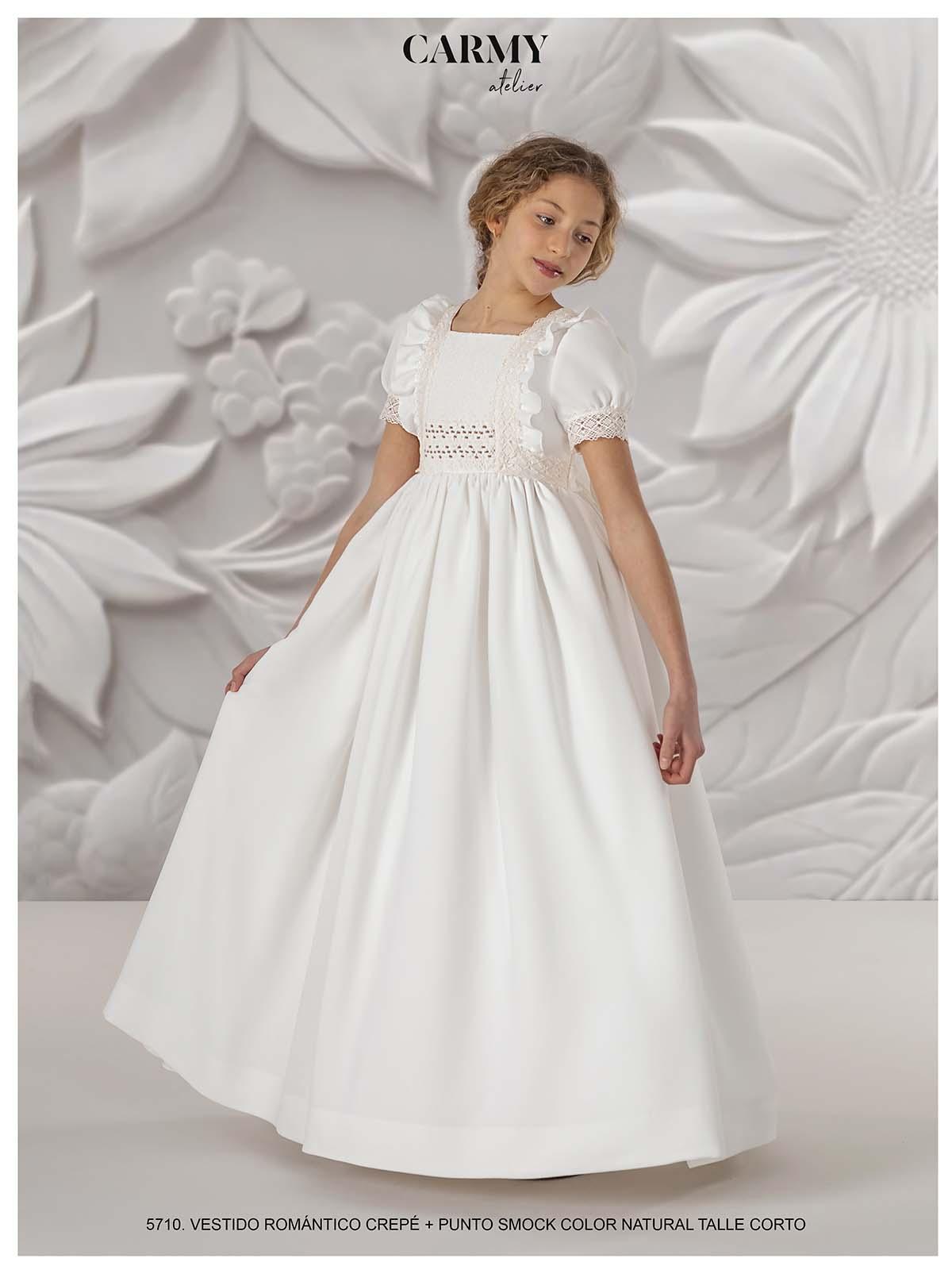 Vestido de comunión romántico elaborado en crepé y punto smock. El tono natural del tejido ofrece una apariencia suave y clásica. Con un talle corto, este vestido es ideal para niñas que buscan un diseño tradicional con un toque moderno. Los detalles en punto smock y la calidad del crepé aseguran una prenda cómoda y encantadora, perfecta para un día de comunión inolvidable!!!