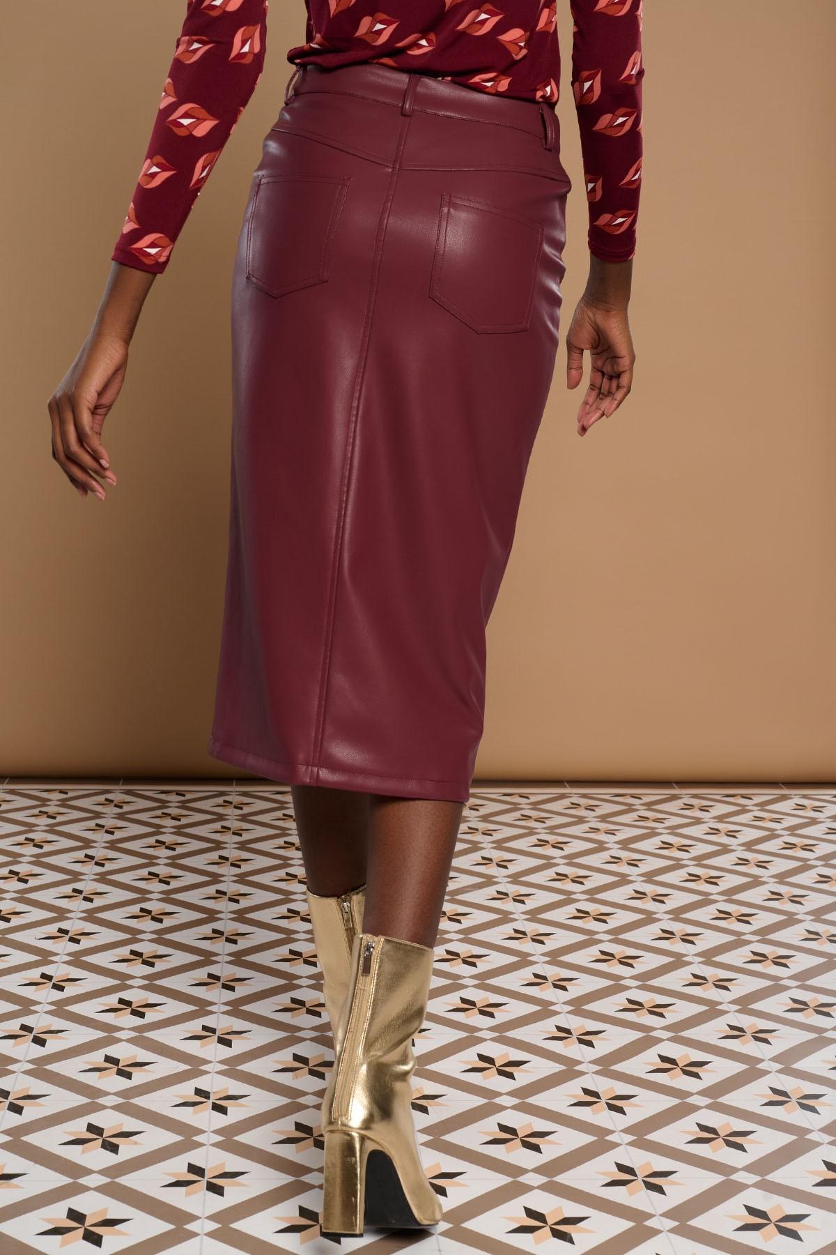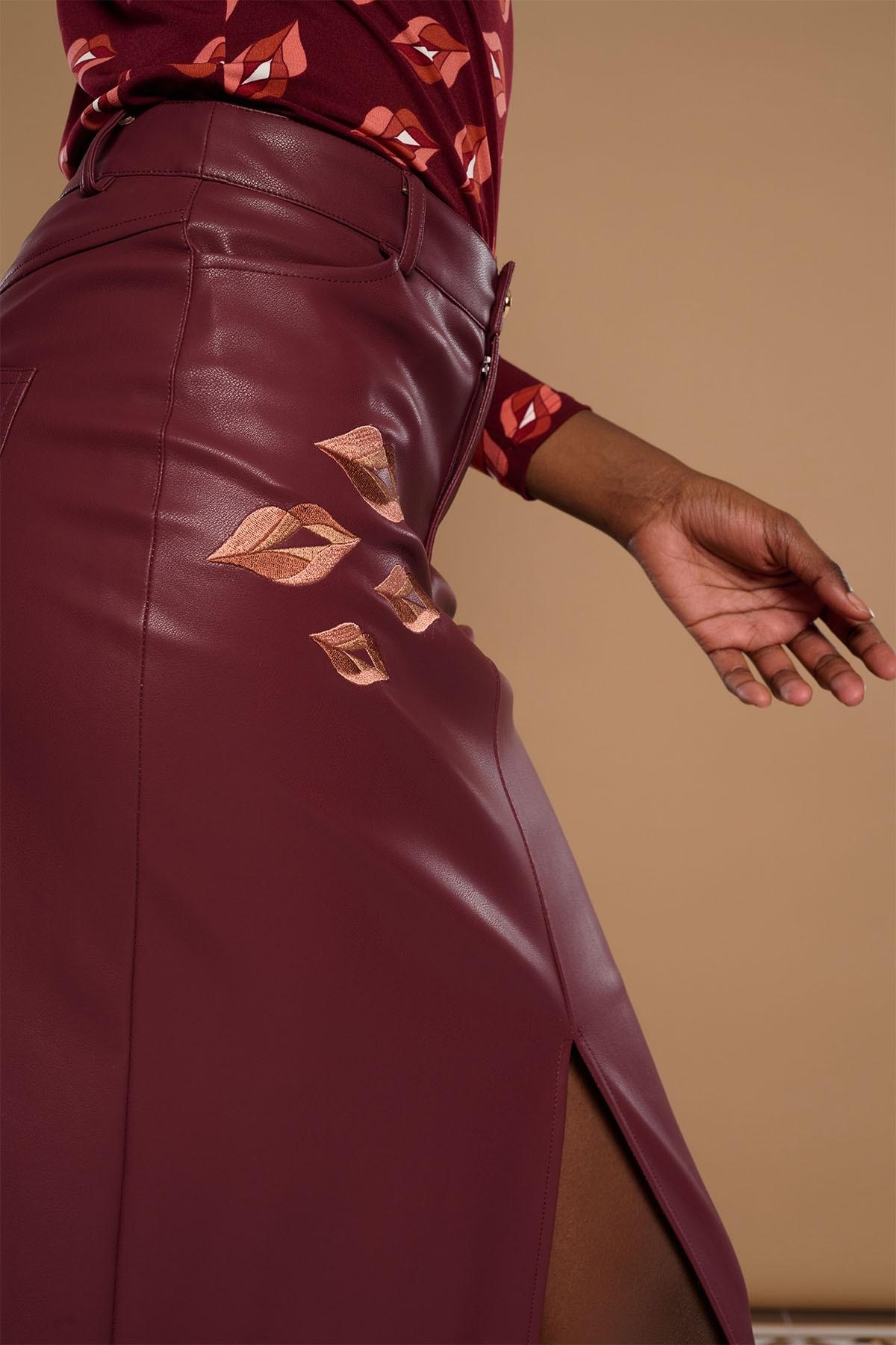 Falda midi de polipiel en color burdeos. Detalle de labios bordados en lateral derecho. Abertura frontal. Cierre con cremallera y botón frontal. Bolsillos delanteros y traseros. Forro interior!!