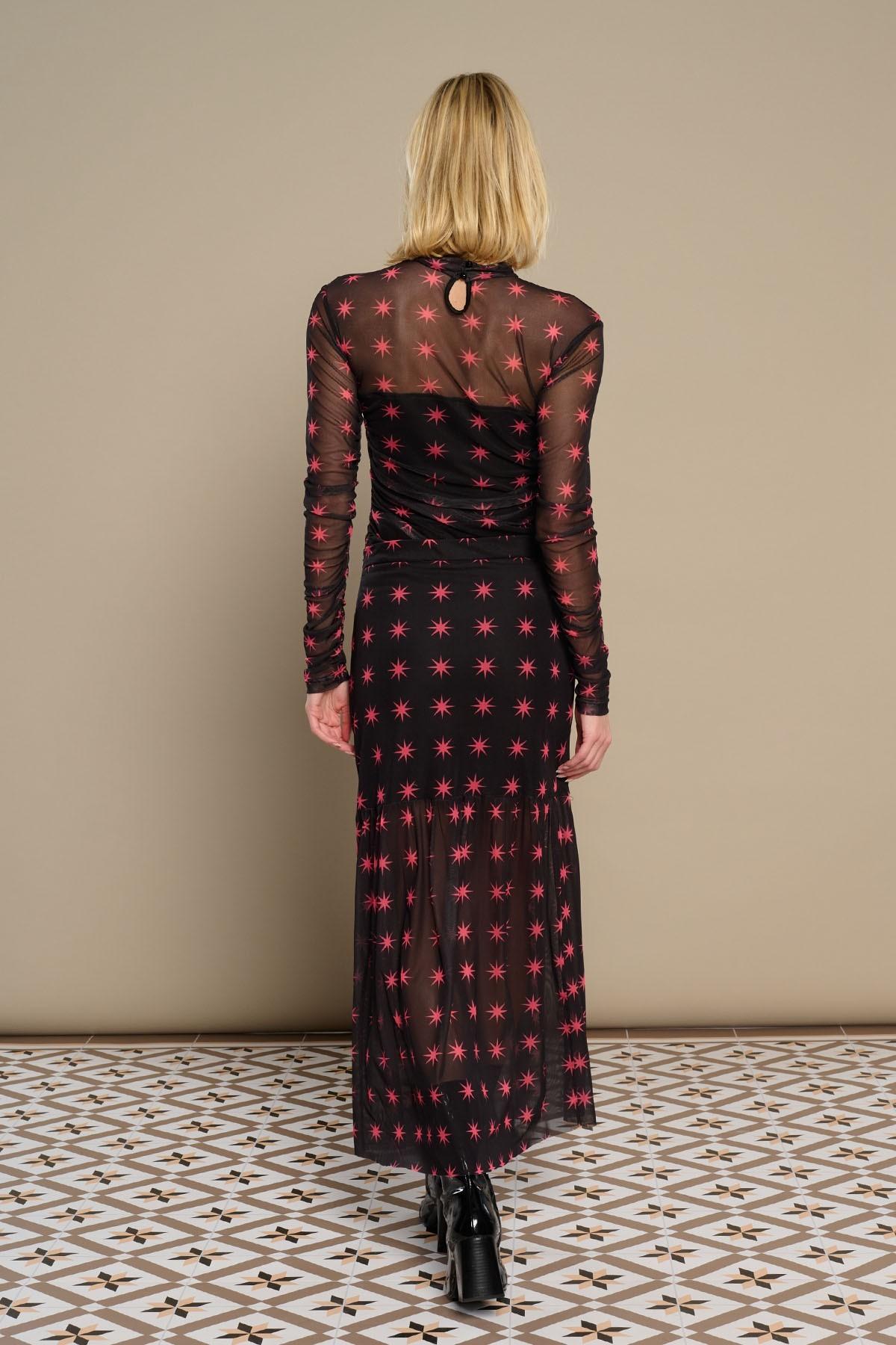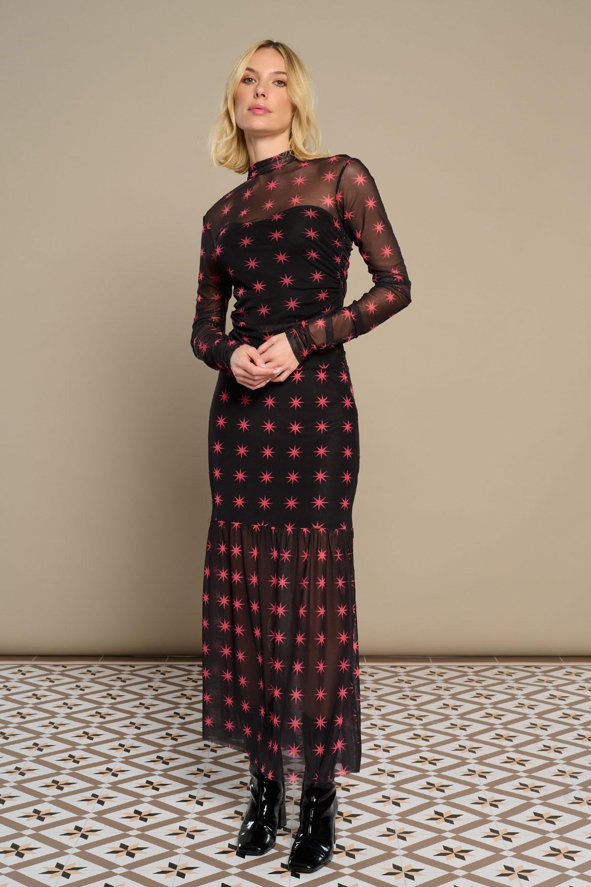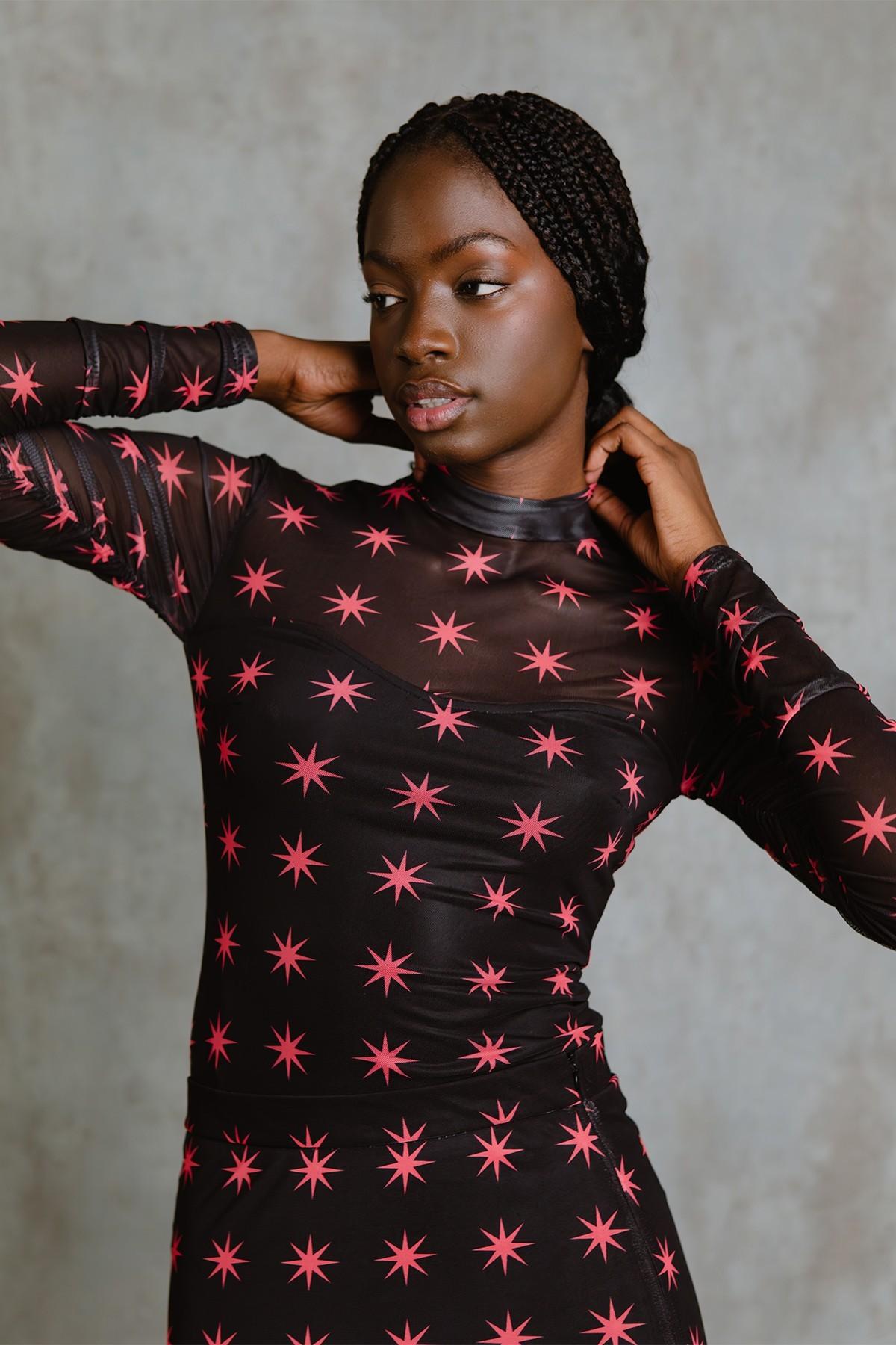 Camiseta de cuello perkins y manga larga. Tejido de tul elástico. Estampado de estrellas. Forro interior. Cierre en espalda con abertura y botón!!!