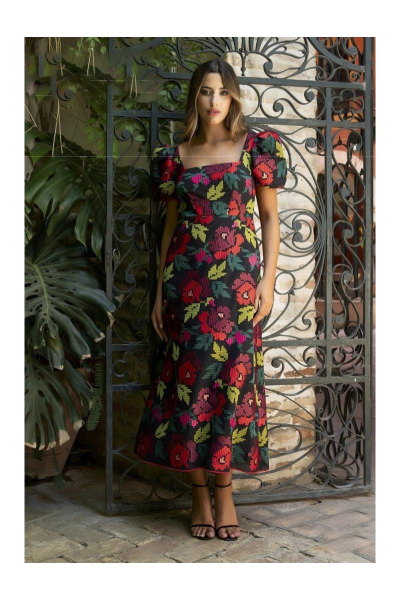 Vestido confeccionado en un maravilloso tejido de jacquard de colores. Cuerpo con escote cuadrado y manga corta abullonada, espalda con abertura al descubierto haciendo de este un vestido muy original. Falda de capa. Se puede usar sujetador!!